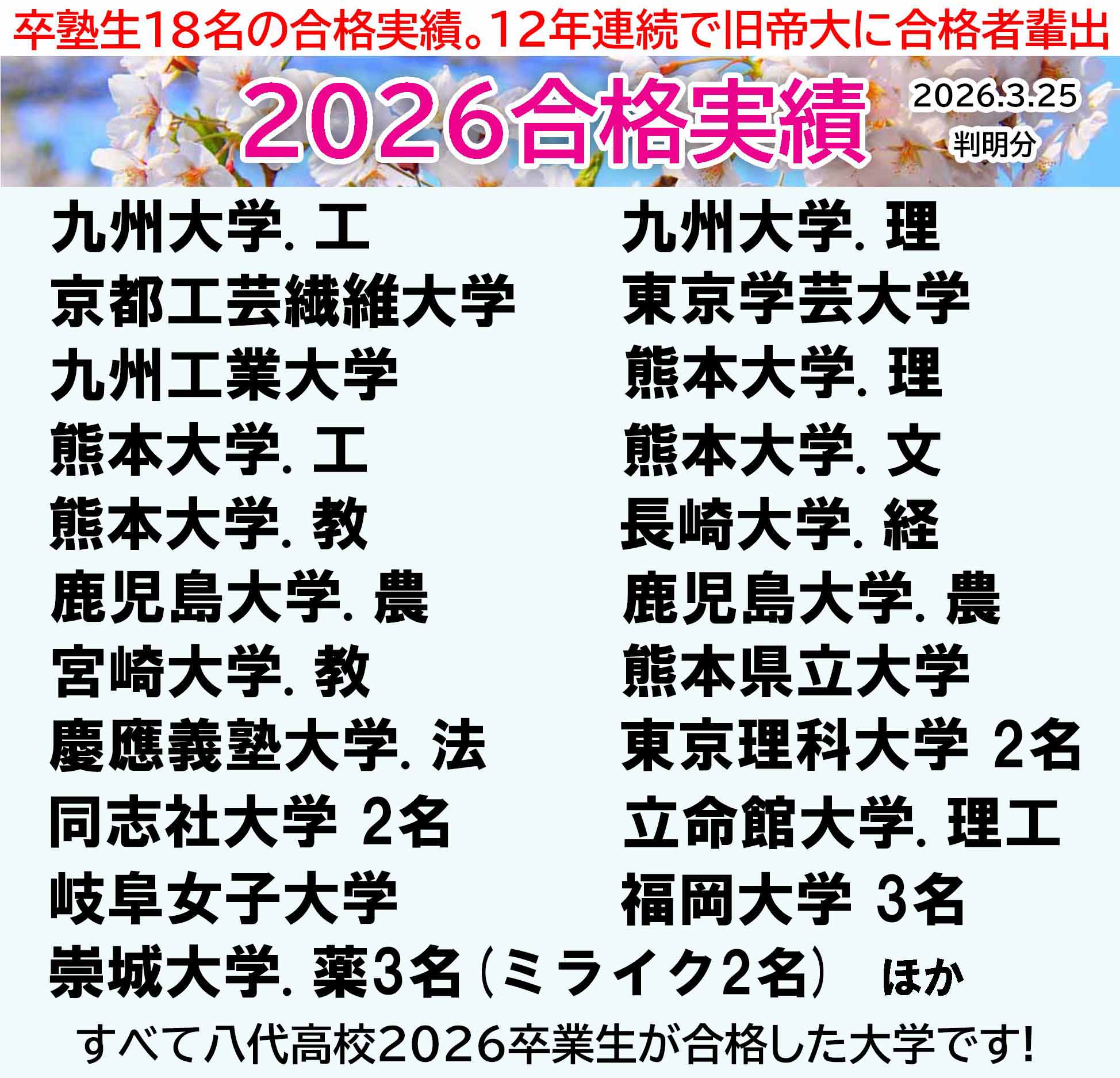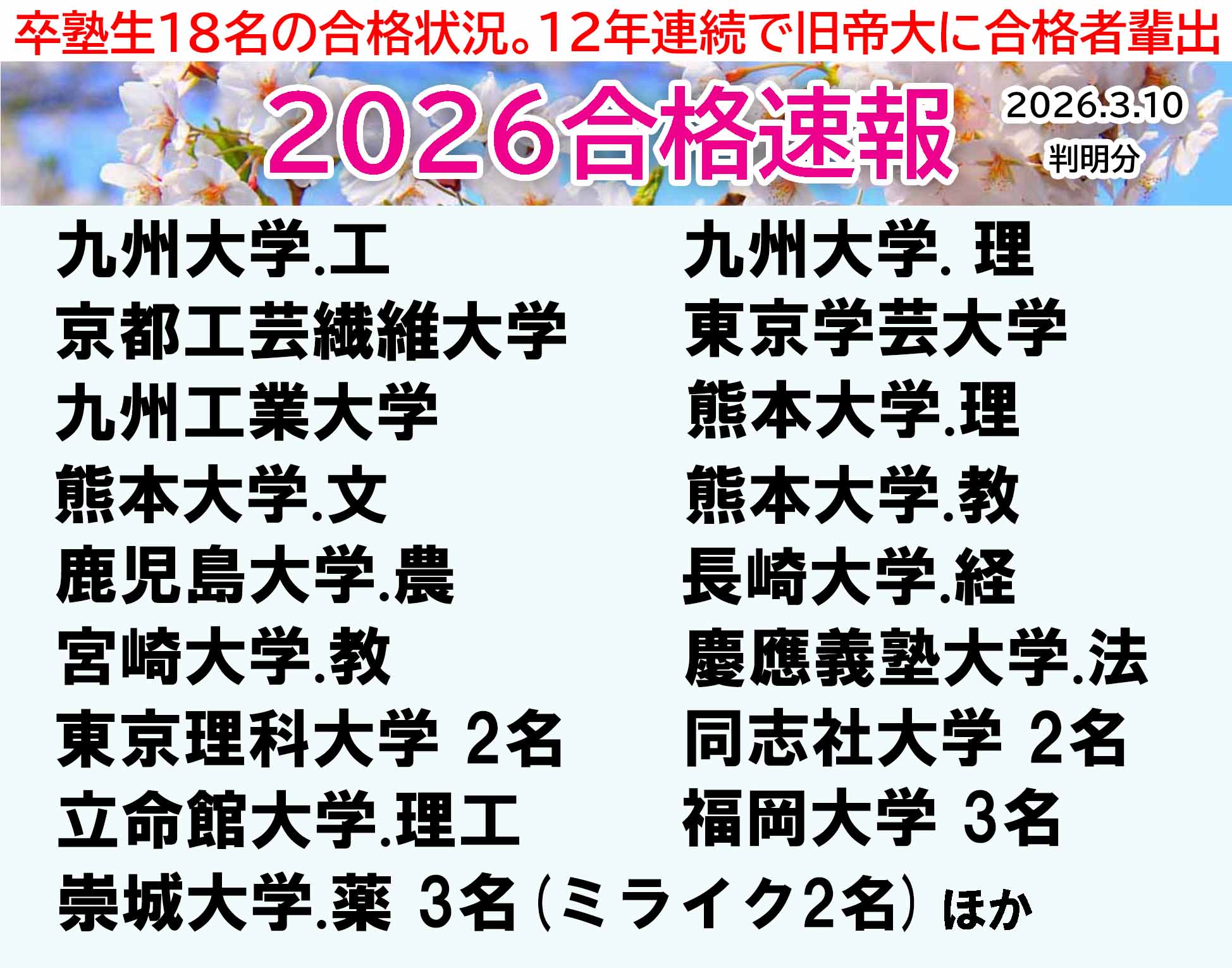 2025~2020入試において、当塾卒塾生が八代高校在籍時に現役合格を果たした大学の一部です。クリック・タップしていただければ、当塾卒塾生の合格までの軌跡をご覧いただけます。