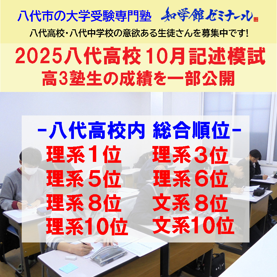 10月に実施された高3ベネッセ駿台記述模試で、当塾の高3生が八代高校の総合学年10位内に8名(理系6名、文系2名)入りました🎉