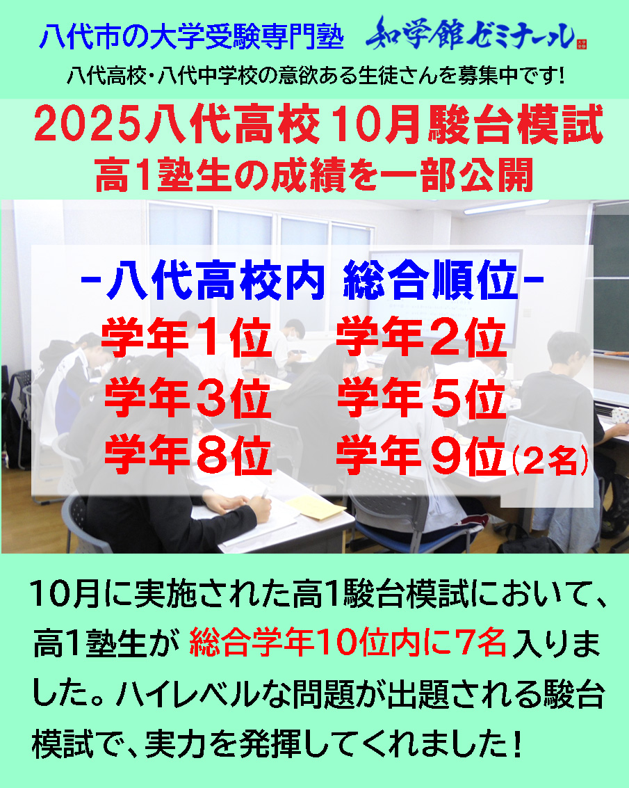 この模試で、当塾の高1生が八代高校の総合学年10位内(英数)に7名入りました。