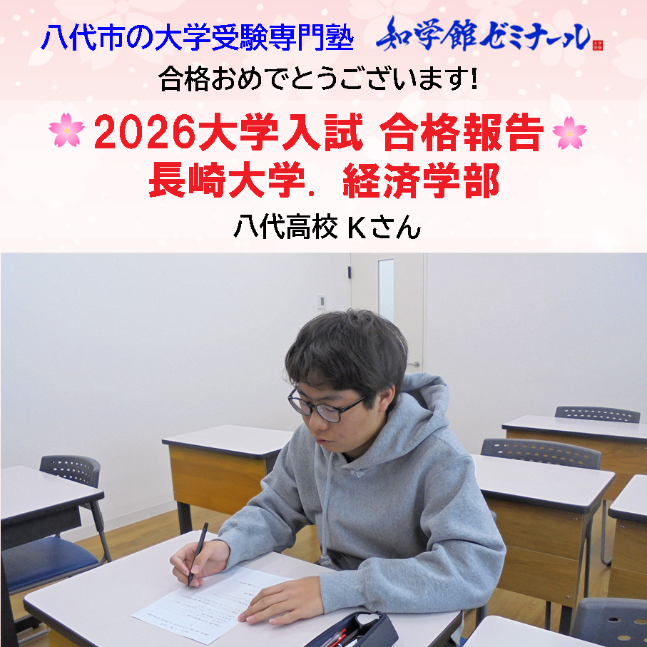 当塾卒塾生のK君(2026八代高校卒業生)が、長崎大学の経済学部に合格しました。