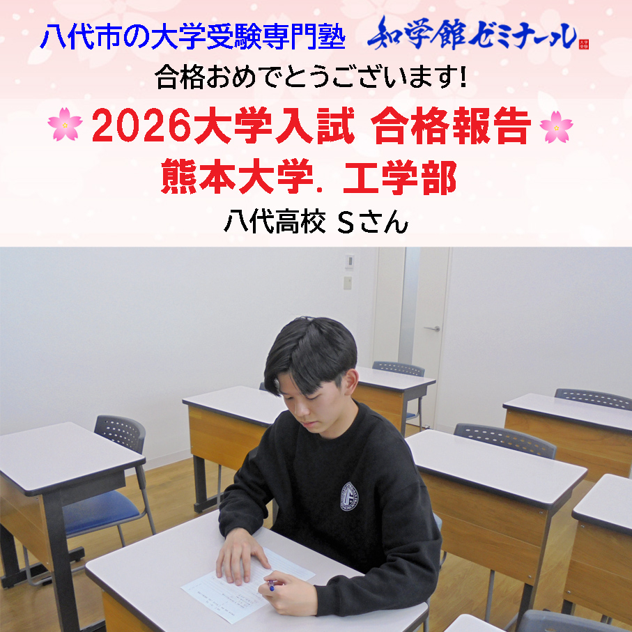 当塾卒塾生のS君(2026八代高校卒業生)が、熊本大学の工学部に合格しました。